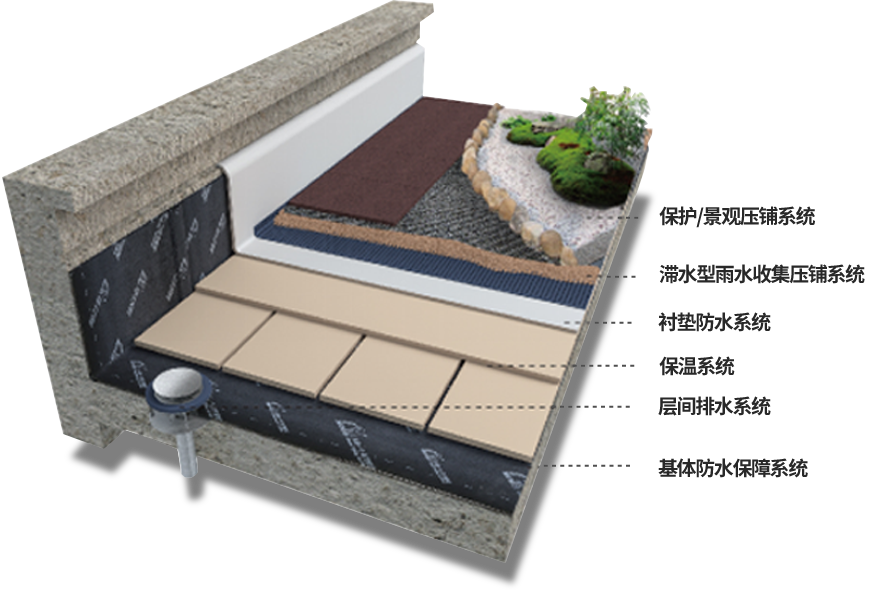 以最大程度的降低滲漏水概率、提高屋面系統(tǒng)使用壽命、維護(hù)結(jié)構(gòu)功能為基本出發(fā)點(diǎn)而開(kāi)發(fā)設(shè)計(jì)的。宜頂工業(yè)化裝配式屋面系統(tǒng)根據(jù)屋面功能需求,設(shè)計(jì)包含了六大子系統(tǒng):基體防水保障系統(tǒng)、層間排水系統(tǒng)、保溫系統(tǒng)、襯墊防水系統(tǒng)、滯水型雨水收集壓鋪系統(tǒng)、保護(hù)/景觀壓鋪系統(tǒng)。各子系統(tǒng)依次施工、協(xié)同作用,確保屋面系統(tǒng)的持久安全。