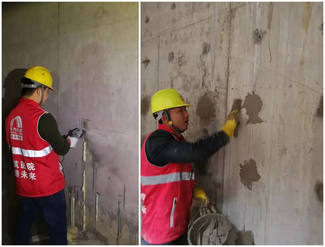 灌漿針頭需要取出,用堵漏2#進(jìn)行孔洞封堵。灌漿針頭為鋁制品。如果殘留在墻體內(nèi)部,由于其和混凝土的熱脹冷縮系數(shù)不同,將來容易在針頭針頭周邊因?yàn)闇囟葢?yīng)力形成裂縫。