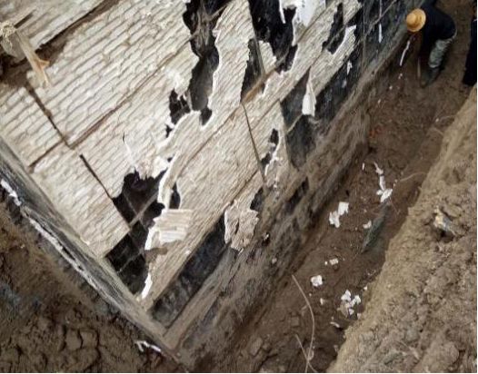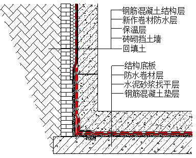 2. 在墻面涂刷基層處理劑,重新鋪貼卷材防水層,邊恢復(fù)保溫邊砌筑擋土磚墻邊回填土方。