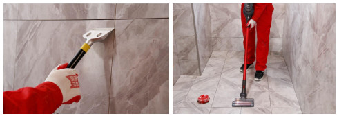 用吸塵器或毛刷清理粉塵:使用粉塵吸塵器將瓷磚縫隙內(nèi)部的粉塵吸干凈,瓷磚縫隙兩側(cè)2cm寬采用抹布擦洗干凈,保證瓷磚縫隙內(nèi)不潮濕,無(wú)粉塵、顆粒、油漬、疏松物等,同時(shí)清潔瓷磚表面污染物。如擔(dān)心使用吸塵器清潔仍不夠徹底,可繼續(xù)采用毛刷清理吸塵器處理不到或難以處理的位置,保證所有的瓷磚縫隙干燥無(wú)粉塵。