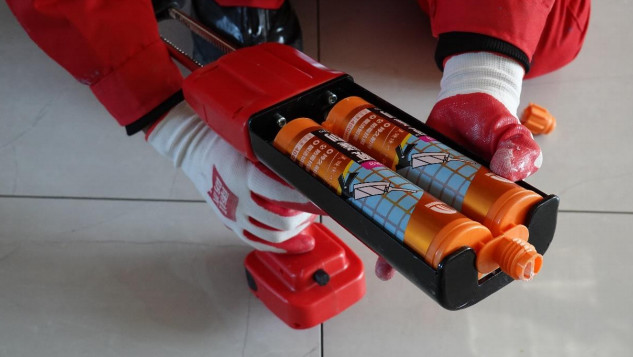 安裝靚縫劑專用膠槍:安裝混合管前先用膠槍擠壓膠管直至AB組分全都從出料口出料為止,隨后將混合管安裝至出料口并套用優(yōu)質(zhì)省力膠槍。
