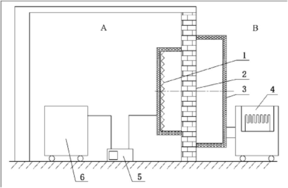 (1.計量熱箱;2.被測圍護(hù)結(jié)構(gòu);3.冷箱;4.制冷裝置;5.控制器;6.環(huán)境加熱器:A.室內(nèi);B.室外。)