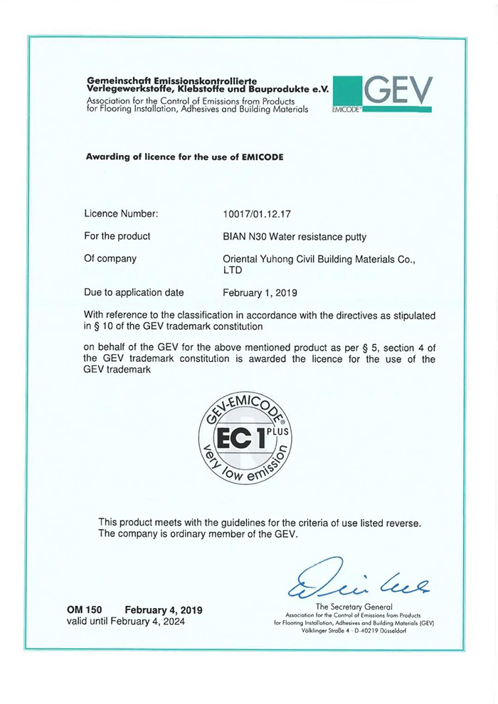 壁安抗堿防霉型N30耐水膩?zhàn)油ㄟ^(guò)歐洲建材環(huán)保性能權(quán)威認(rèn)證機(jī)構(gòu)——德國(guó)GEV建立的EMICODE分級(jí)體系最高標(biāo)準(zhǔn),獲得EC1PLUS證書,該產(chǎn)品可最大限度保證居住環(huán)境的空氣質(zhì)量。