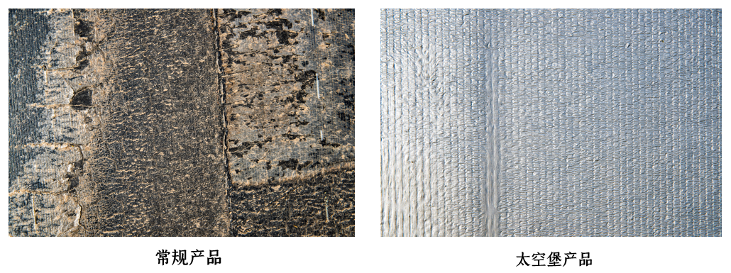 常規(guī)產(chǎn)品在施工一周后,隔離膜逐漸風(fēng)化,瀝青基主體失去保護。