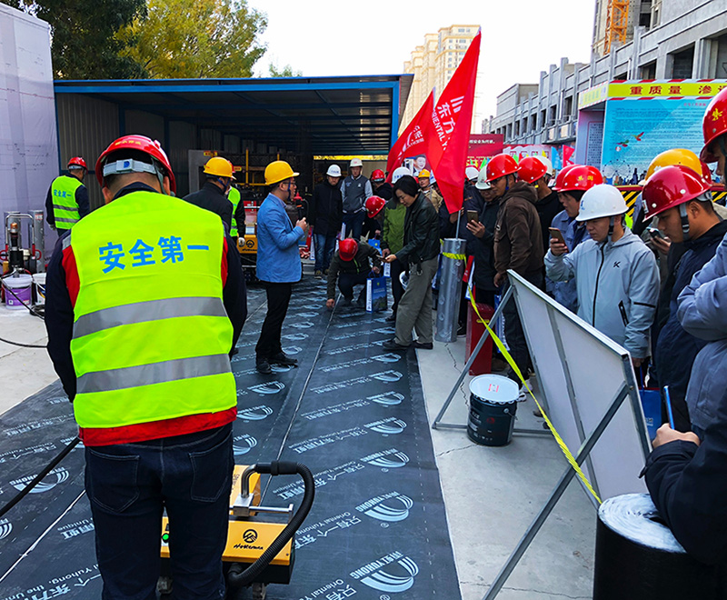 會上,東方雨虹對近幾年被廣泛應(yīng)用于現(xiàn)代建筑中的非固化復合防水體系的產(chǎn)品特點和施工工藝進行詳細講解。為了提高建筑防水施工效率,并減少人為因素造成的誤差,東方雨虹技術(shù)人員現(xiàn)場展示了“虹人”智能型熱熔防水卷材攤鋪機車“坦途”和“騎行者”在平面熱熔滿粘施工和熱熔瀝青卷材搭接邊焊接中的應(yīng)用。