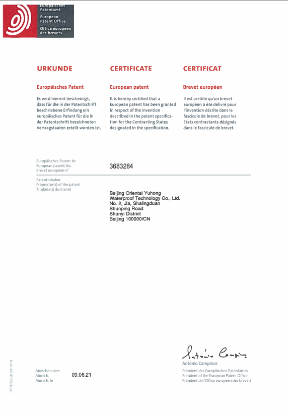 近日,東方雨虹獲得由歐洲專利局(EPO)頒發(fā)的歐洲發(fā)明專利授權證書(專利號EP3683284)。該專利是東方雨虹HDPE產品研發(fā)過程中產生的核心成果之一。