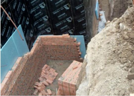 2. 在墻面涂刷基層處理劑,重新鋪貼卷材防水層,邊恢復(fù)保溫邊砌筑擋土磚墻邊回填土方。