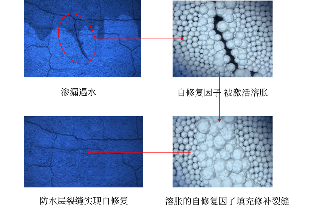 當防水涂膜出現微小裂紋或損傷后,涂料中自修復因子遇水激活,膨脹成凝膠狀,并在水化作用下,形成堅硬的化合物填補裂縫,有效防止反復滲漏,降低維修成本。